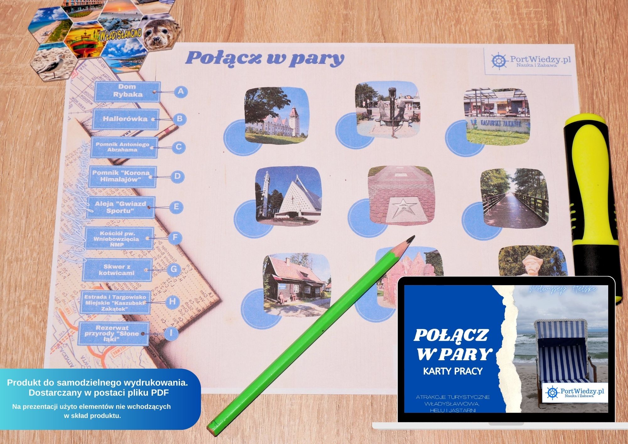 „Półwysep Helski. Atrakcje turystyczne – Połącz w pary” to nie tylko świetna zabawa, ale również skuteczny sposób na rozbudzenie ciekawości i pasji do poznawania nowych miejsc. Dostarczenie produktu w formie pliku PDF, umożliwia samodzielny wydruk materiałów, co pozwala użytkownikom wielokrotnie korzystać z karty pracy w dowolnym miejscu i czasie, bez konieczności dostępu do Internetu.